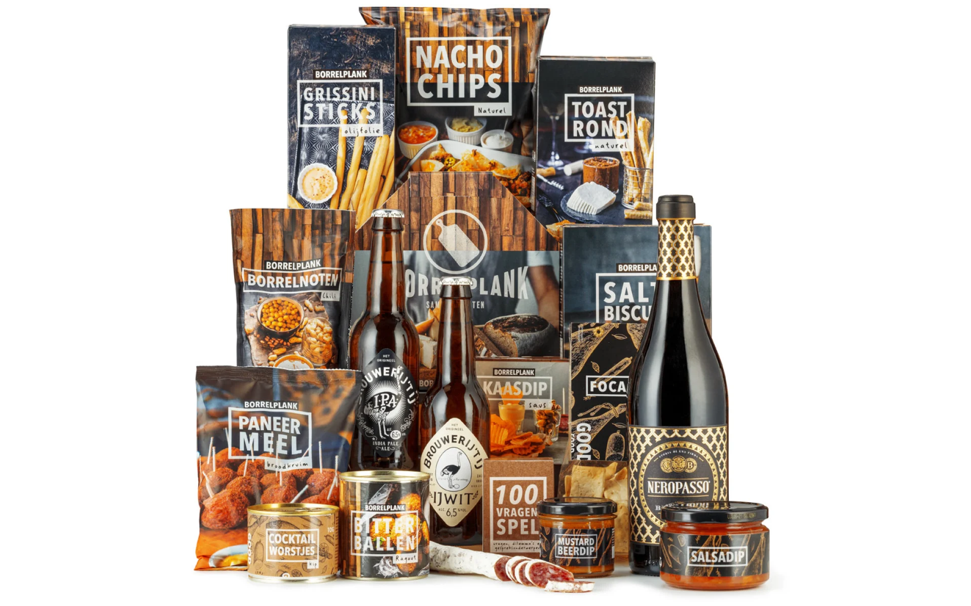 Dompel jezelf onder in feestelijkheid met ons kerstpakket vol lekkernijen! Geniet van Biscardo Neropasso rode wijn en Brouwerij 't IJ IPA en IJwit bieren. Met smaakvolle dips, knapperige snacks en zelfgebakken borrelbrood wordt je borrel compleet. Speel het 100 vragen spel, proef zelfgemaakte bitterballen en cocktailworstjes. Voeg pit toe met chili borrelnoten en ontdek de hartige perfectie van Crissini sticks, Focacette rozemarijn en droge Fuet worst. Dit zorgvuldig samengestelde kerstpakket brengt het feest naar jouw borrel!